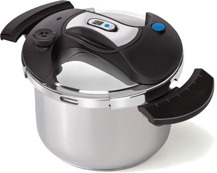 Szybkowar o pojemności 7 l, ze wskaźnikiem ciśnienia w pokrywie, timerem, pokrywą szklaną, wkładem do gotowania na parze z funkcją tarki do jarzyn oraz z podstawką pod wkład.